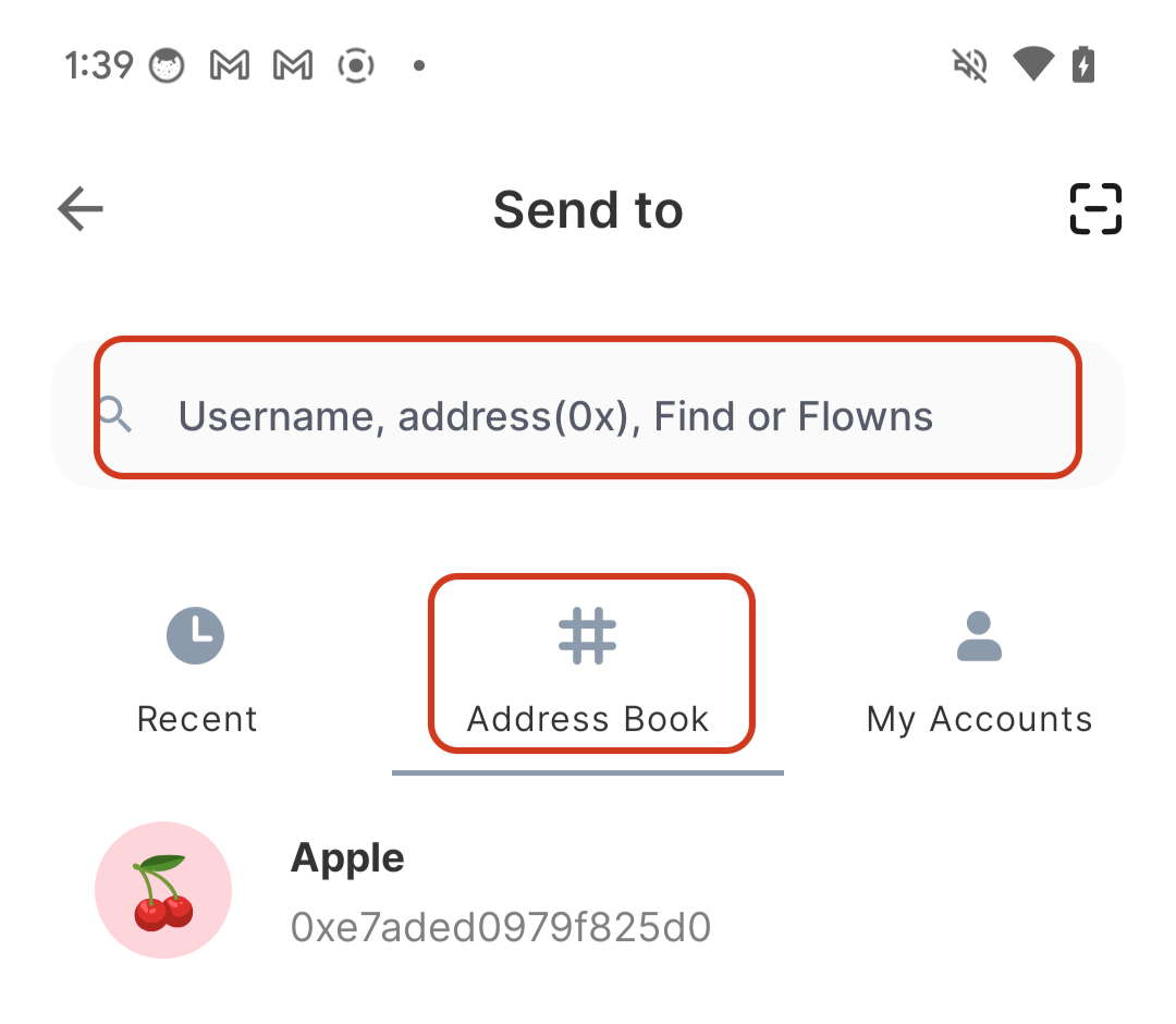 Step 2: Enter the recipient's COA/other Flow account address, otherwise you can choose recipient's address you already save in address book .